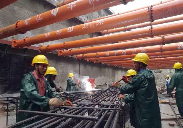 三里壩站地下管線多,給排水、電力燃氣等10多條管線縱橫交錯,遷改困難,制約主體全面打圍施工。項目部全力配合管線遷改,方百計推進主體施工,6月底實現(xiàn)全面打圍施工,8月20日進入基坑開挖工序,9月28日第一塊板澆筑,到封頂僅用了78天,其中10月份創(chuàng)造了月澆筑10板的記錄。