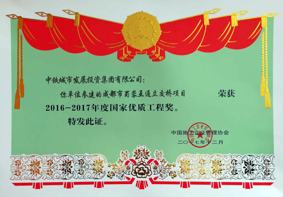 中鐵城投集團(tuán)工程總承包管理、中鐵一局四公司施工的成都天府新區(qū)蜀蓉立交橋工程項(xiàng)目榮獲2016至2017年度國家優(yōu)質(zhì)工程獎(jiǎng)。