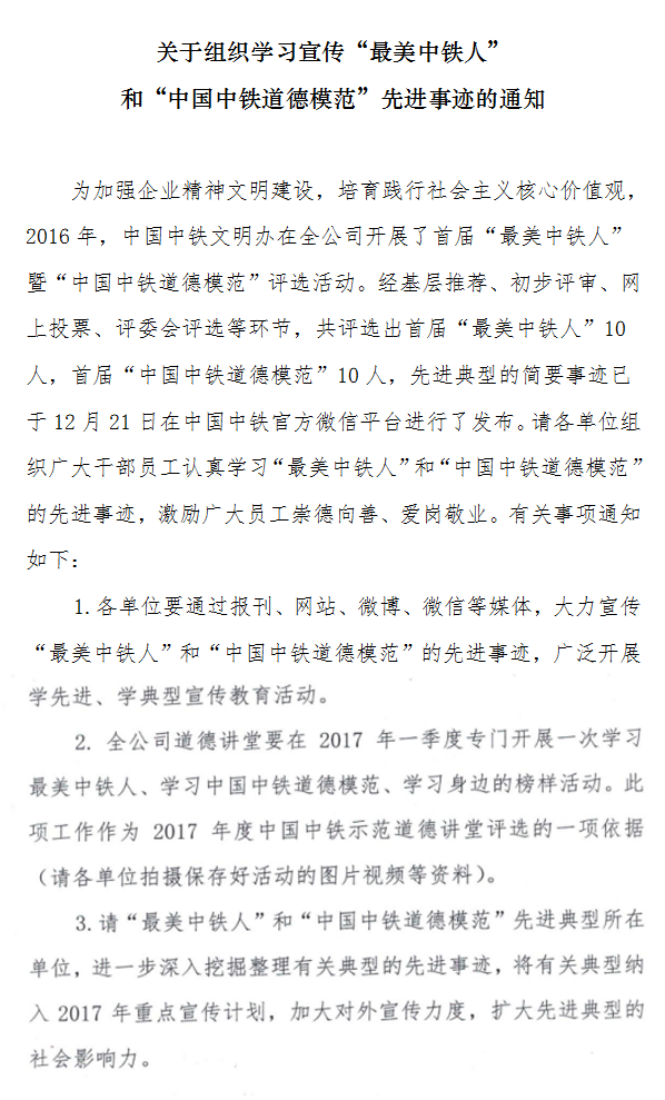 編前:為加強(qiáng)企業(yè)精神文明建設(shè),培育踐行社會主義核心價值觀,2016年,中國中鐵文明辦在全公司開展了首屆“最美中鐵人”暨“中國中鐵道德模范”評選活動。經(jīng)基層推薦、初步評審、網(wǎng)上投票、評委會評選等環(huán)節(jié),共評選出首屆“最美中鐵人”10人,首屆“中國中鐵道德模范”10人。按照中國中鐵股份有限公司黨委宣傳部要求,在此發(fā)布以上先進(jìn)典型事跡,激勵廣大員工崇德向善、愛崗敬業(yè)。